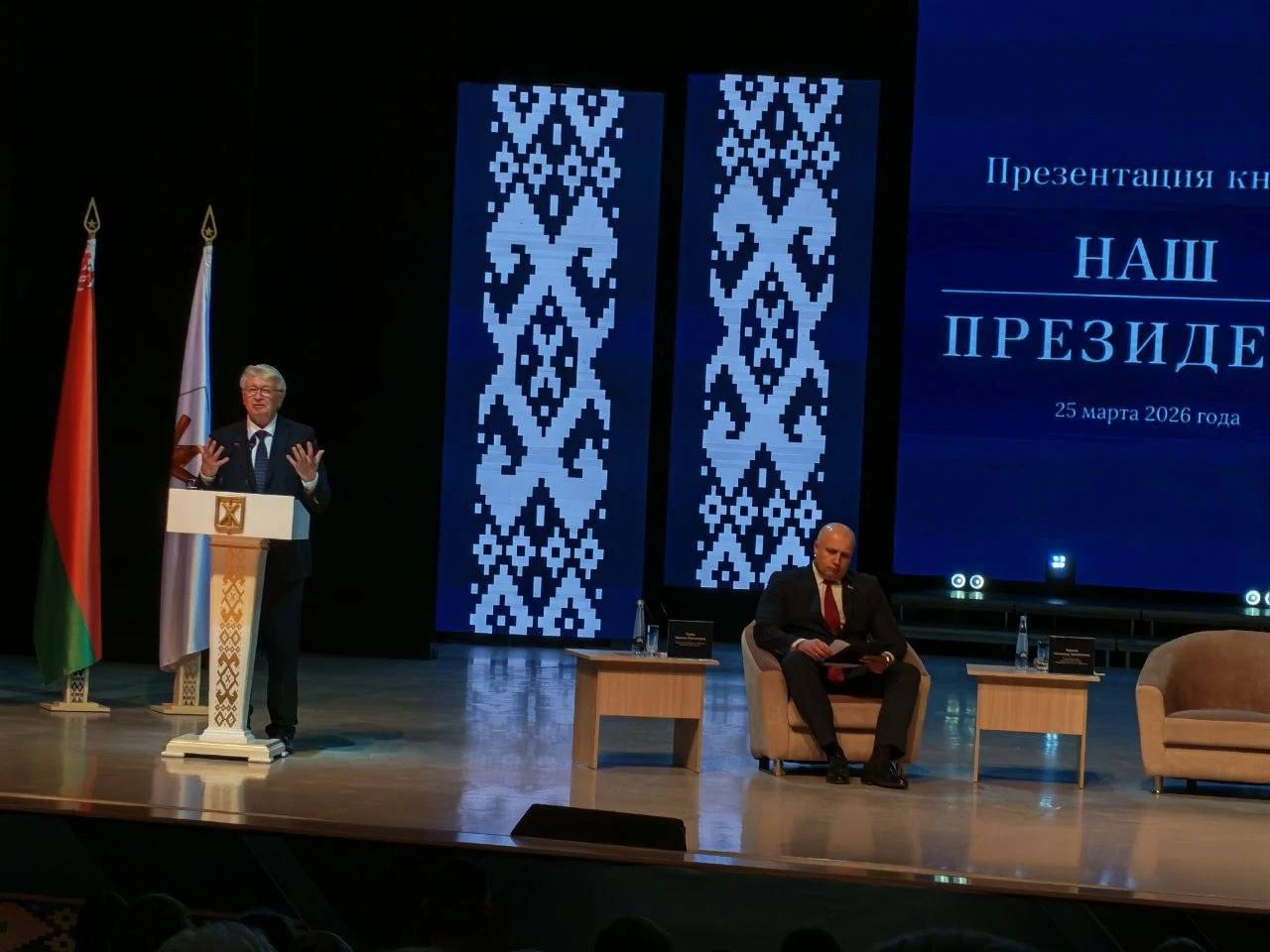 25 марта во Дворце искусств состоялась презентация документально-биографического издания «Наш Президент» с участием авторов – заслуженного деятеля науки Беларуси, доктора педагогических наук, профессора Александра Радькова и директора издательства «Беларусь», председателя Союза писателей Беларуси Александра Карлюкевича.